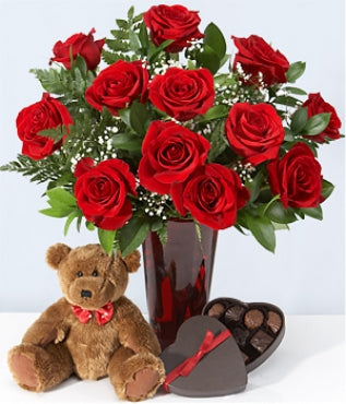 This is it, everything you need to "WOW" her this Valentine's Day in one special offer. This special package includes 12 premium long stem red roses, the upgraded ruby vase, chocolate truffles, and our Valentine's Day Bear. The classic: 12 red roses, long stems, with baby's breath. There is no flower that expresses true love as timelessly and as perfectly as the long-stemmed red rose.