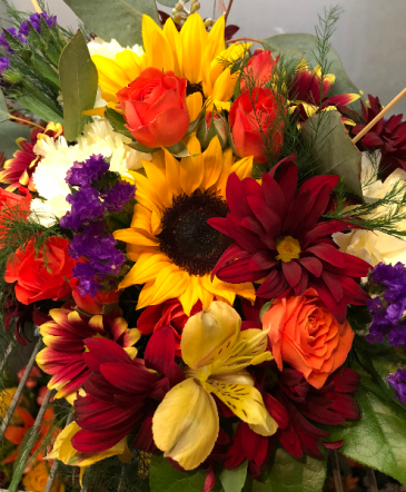 A pretty arrangement of long-lasting mixed chrysanthemums reflecting the rich colors of autumn, perfectly accompanied by sunflowers, roses, alstroemerias and fresh Italian greenery
