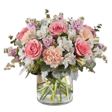 Enchant someone today! Pink roses, peachy spray carnations, alstroemerias all perfectly arranged in a glass vase.