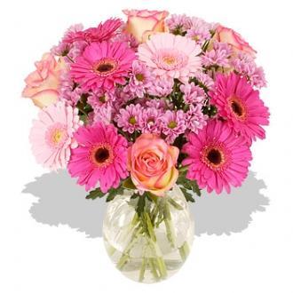This bouquet is an eclectic mix of subtle, feminine flowers. The bright pink gerberas are perfectly complemented by the soft pink roses and the charming small pink chrysanthemums. A simply adorable bouquet guaranteed to thrill any lover of traditional flowers.