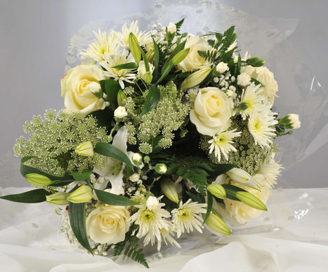 Introducing an elegant classic floral design. The deluxe white bouquet flowers is a graceful bouquet that our florist will complete with a beautiful gift wrap and a bow.
