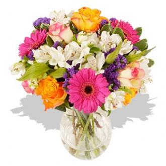 This charming small bouquet will send a breath of fresh colourful airwith its clear bright colours and the lovely selection of different flowers, each with their own particular style.