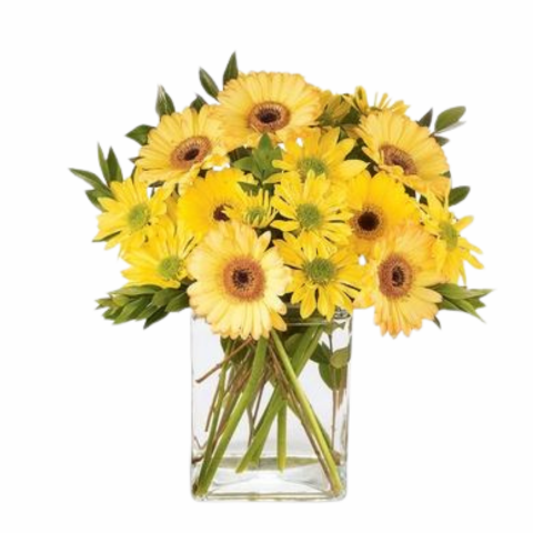 Send someone this cheerful bouquet of happy-faced yellow blooms presented in a clear glass vase – and they’re sure to have a wonderful day.