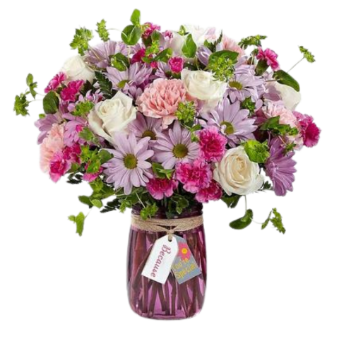 Enchant someone today! White roses and spray roses, lavender daisies and spray carnations, all perfectly arranged in a pink glass vase.