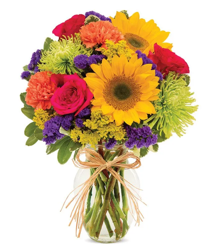 Fill this Summer with flowers! The Bright Sunflower Bouquet is arranged by a florist near you with Sunflowers, pink roses, green mums, orange carnations and more. All the Summer floral stems are put in a clear glass vase that is wrapped with a raffia bow. Choose to have the Bright Sunflower Bouquet delivered for a birthday, graduation or just because. A Summer Sunflower gift will make someone's day!