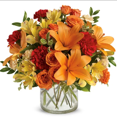 This fall cottage pumpkin-colored flower bouquet charms with its rustic autumn-inspired air. This affordable discount floral arrangement features bright canary-hued alstroemeria with warm tones of varying oranges with spray rose, lily, red, and peach miniature carnation blooms.