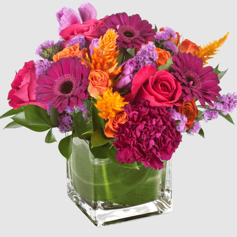 Magenta gerberas, pink roses and yellow accent flowers make this arrangement a bold and beautiful summer delight.