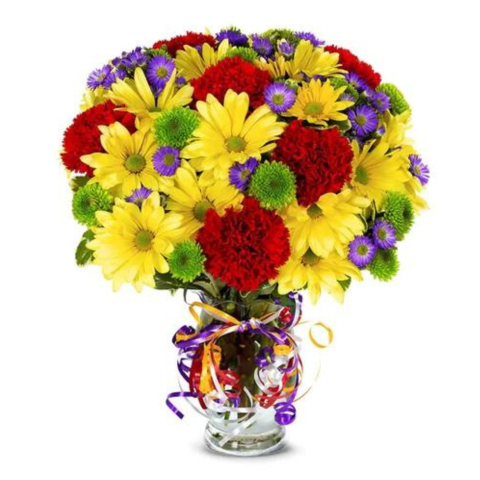 This colorful bouquet is the perfect way to celebrate a special day. In this overflowing bouquet, you will find a variety of vibrant colors and seasonal flowers - from red carnations to yellow daisies as well as purple monte casino and green button poms. Delivered in a glass vase, this bright bouquet is wrapped in colorful ribbon and is available for delivery today.