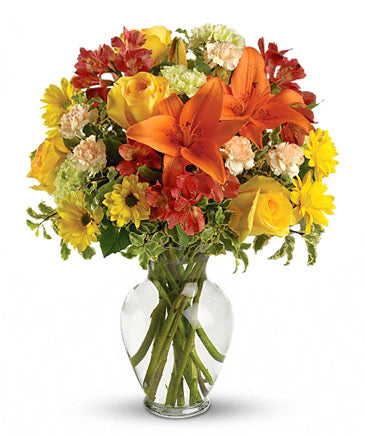 Autumn Brights arrangement features a rainbow of cheerful alstroemerias, lilies, roses, daisies overflowing in a clear vase.
