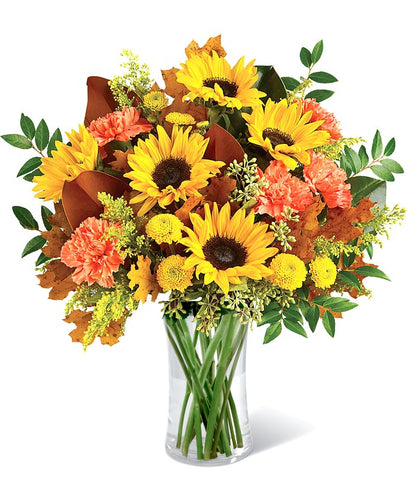 Pretty and practical join forces this fall season to present your recipient with a lovely floral bouquet! Brighten any autumn day with the addition of this delicately designed arrangement.