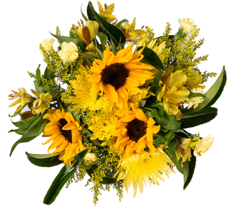 Bursting with gorgeous yellow flowers, this bouquet is perfect to bring cheer and warmth to someone’s day! This arrangement features Solidago, Sunflowers, Alstroemeria, Mini carnations, spider mums, and greenery, it can't get better than this.