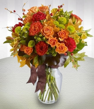 Celebrating a special occasion this fall? Send a festive bouquet of fresh flowers representing all the wondrous beauty of nature in autumn colors of orange, red, yellow and green. Hand-delivered in a glass vase, and decorated with a glossy satin ribbon, its a sweet gift for anyone in your life.