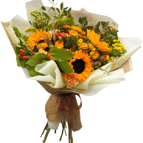A beautiful mixture of sunflowers, daisies, carnations, and seasonal greenery! This arrangement is giving us cheerful fall vibes, so it's great for any reason! Please note: color may vary!