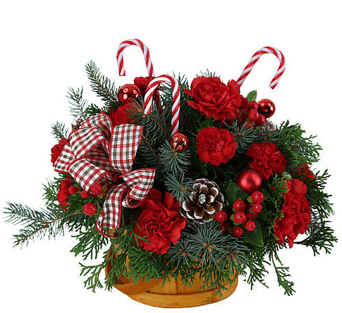 A natural woven basket is arranged with red carnations, frosted pinecones, red berries, red ornamental balls, a holiday bow, Christmas greens, and candy canes! What's not to love?