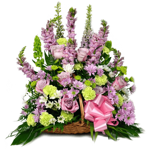 A complementary mix of flowers and greens hand-arranged in a beautiful basket; containing lavender delphinium, snapdragons, and daisy pompons combined with green carnations and bells of Ireland. This soothing, elegant bouquet will help you offer comfort and support during a difficult time.