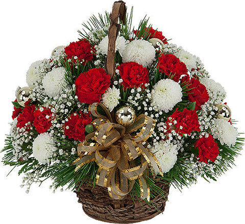 Make the rest of their holiday decorations blush by sending our abundant basket arrangement of fresh red and white carnations. Especially around the holidays, basket arrangement brings a sense of comfort and joy to friends and family.