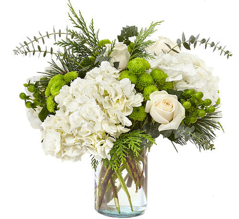 - Only selected fresh-cut white flowers - Roses, Hydrangeas, Mums and fresh greenery