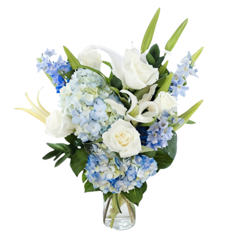 - Selected roses, premium hydrangea and fresh-cut lilies arrive perfectly arranged with Italian greenery in a stylish clear glass vase.