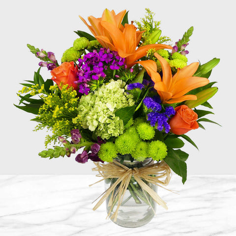 They brighten your day, every day. So, let them know how much it means to you with this colorful assortment of cheerful fall blooms, thoughtfully arranged in a softly rounded vase with autumn accents.