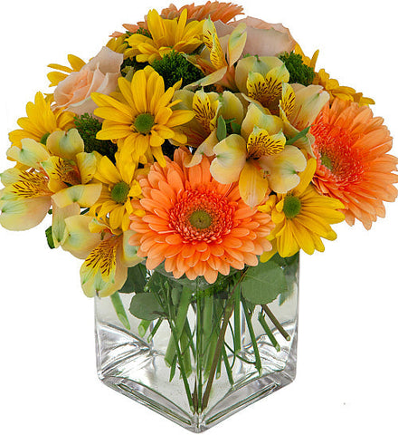 Pretty design in a clear glass cubed vase, featuring sunny yellow alstroemeria and daisies paired with peach roses and salmon gerbera. A delightful color and blooming combination for your best wishes.