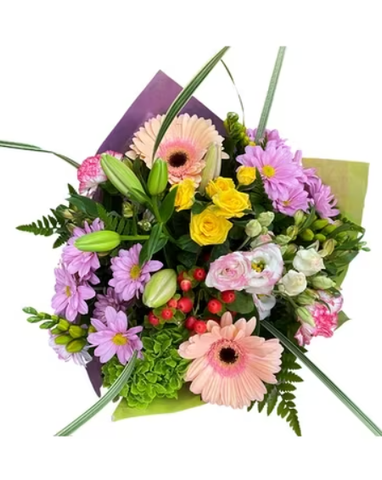 - This bouquet includes gerbera daisies, carnations and spray roses