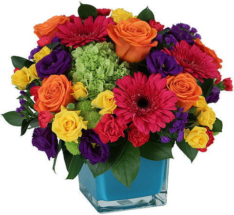 Send them pure bliss! This vibrant bouquet is sure to put a smile on anyone's face! This combination of orange, pink, yellow, purple and green blooms is complimented beautifully with a glass clear vase!