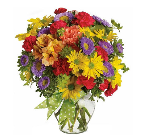 All their wishes will come true when they receive this bright and sunny flower arrangement – a summery mix of yellow daisies, purple asters, hot pink and orange carnations and more, adorned with a cheerful bow. Send one today, and make someone’s day!