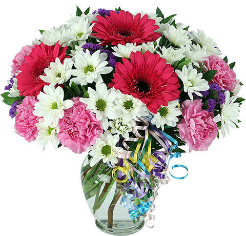 A charming clear vase filled with pink gerbera daisies, pink carnations, white mum daisies, and greens. A great gift to celebrate a Birthday!