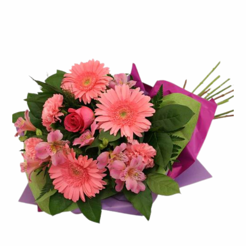 Wrapped bouquet of freshly cut pink flowers. Features pink alstroemerias, pink Gerbera daisies, pink carnations and roses.