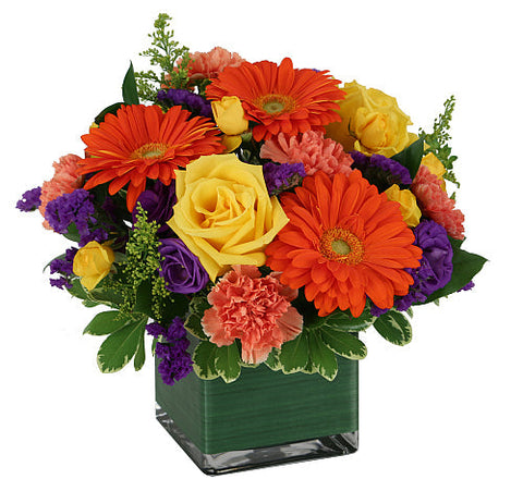 Make an autumn splash with a pop art mix of yellow roses, set against a jumble of hot purple, orange and green flowers and presented in a modern glass cube vase! This vivid bouquet will bring warm-weather fun to someone’s day.