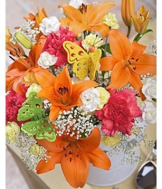 This eye catching bouquet includes exotic Asiatic Lilies, together with vibrant yellow and white spray Carnations and delicate white Gypsophila. Finished with vivid citrus coloured butterfly picks - a sure talking point on any coffee table!