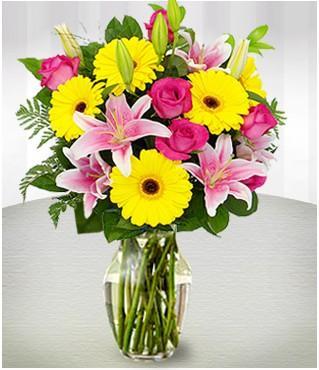 - The arrangement includes 6 hot pink roses, 3 pink oriental lilies, 5 yellow gerbera daisies accented with greens