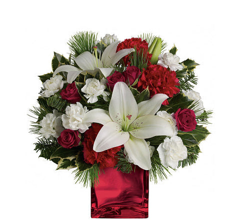 This festive, affordable holiday bouquet features red roses and white Asiatic lilies presented in a red cube vase, accented by tips of white pine, noble fir, and holly.