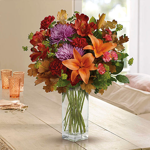 Brighten any fall day with this colorful array! Gorgeous orange lilies arranged with red and lavender blooms are sure to make someone smile!