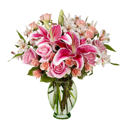 Show someone that she’s in your heart forevermore with this gorgeous floral arrangement of peach and pink roses, Stargazer lilies and mixed spring flowers.