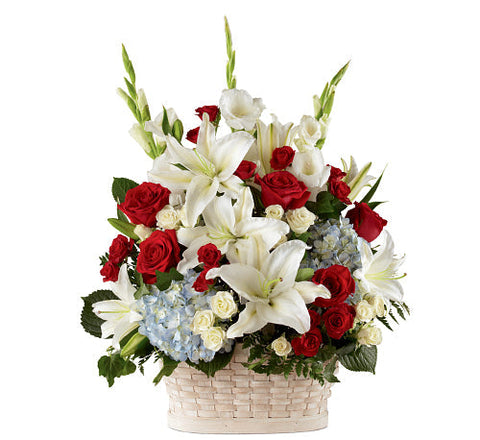 Celebrate the life of a departed friend or family member with an exuberant bouquet of red, white and blue flowers. Comforting memories of a life well-lived are bought to mind with red and white roses, white gladioli and Oriental lilies, and blue hydrangeas beautifully arranged in a simply lovely white woodchip basket. Perfect for floor or tabletop display at a wake, for an altar or in a sanctuary at the funeral or to send to the home of grieving family and friends.