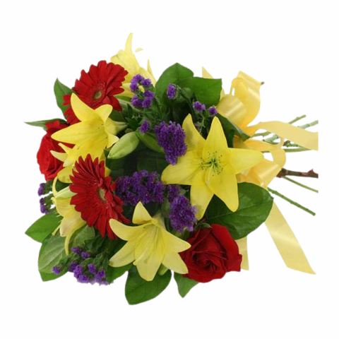 Gorgeous bouquet of bold, vibrant colors featuring red roses, Gerbera daisies, yellow lilies and purple statice, wrapped and tied with yellow ribbon. Suitable for many occasions or sentiments.