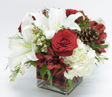 For a wintertime bouquet that's as pure as the driven snow, send this unexpected gift of red roses and white lilies, accented with pine cones, alstroemeria, and greenery. A simple pleasure for the loved ones!