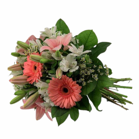 This pretty bouquet of white and pink flowers is a wonderful way to send your best wishes for a happy day. Fresh cut flowers include fragrant lilies, Gerbera, alstroemeria and waxflower.