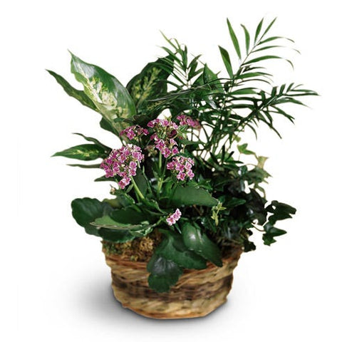 A wonderful garden of green and flowering plants in a basket makes for a stunning presentation and a long-lasting gift. A lovely pink kalanchoe, English ivy plant, palm plant, and dieffenbachia plant are beautifully arranged in a keepsake basket. Great to send for any occasion - or no occasion at all!