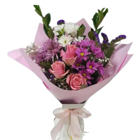 This bouquet includes bright pink roses, mums, baby's breath, fresh greenery.