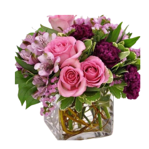 Pink roses, purple alstroemeria, burgundy carnations, and more are arranged in a cuve vase. What a delight!