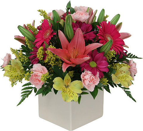 A simple gift of pretty flowers, expertly arranged in a rounded, compact design... meant to convey your thoughts and wishes for a speedy recovery, comfort and wellness. Please note that vase may vary.