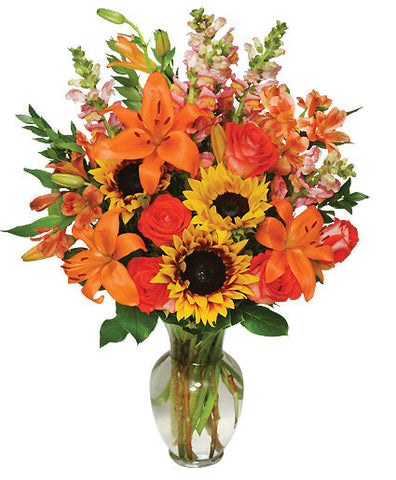 Sunny sunflowers, mums, lilies, alstroemerias and autumn greens are beautifully arranged in a clear glass vase.