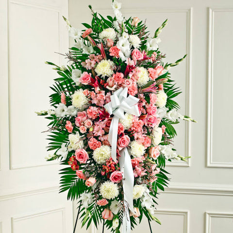 Express your deepest sympathies, and extend a gracious note to a service or memorial, with this soft spray of pink and cream blooms surrounded by a frame of elegant greens.
