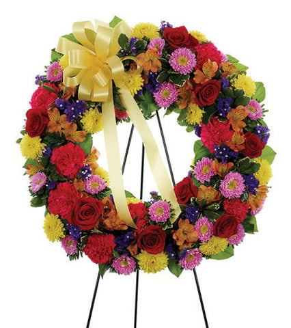 It is a time of sadness, but life does go on, and this brilliantly colored wreath of orange, red, yellow, pink, blue, and purple flowers is a tasteful reminder.