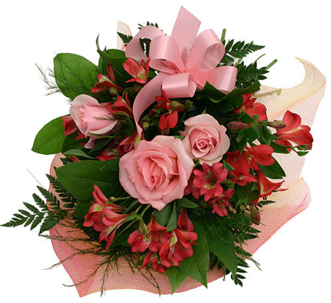 Lovely wrapped bouquet of 3 or more pink roses with pink or red alstroemerias, assorted greenery, and matching pink bow. A simple, affordable bouquet for anytime gift giving.