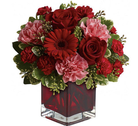 Hoping to be together forever? Whether you’d like to send a flowery message of love to a favorite beau, best friend or family member on Valentine’s Day, this sentiment of your affection – delivered in a special red cube vase – will make them blush with happiness. A mix of roses, carnations and more in shades of red and pink accented with greenery is delivered in a cube vase.