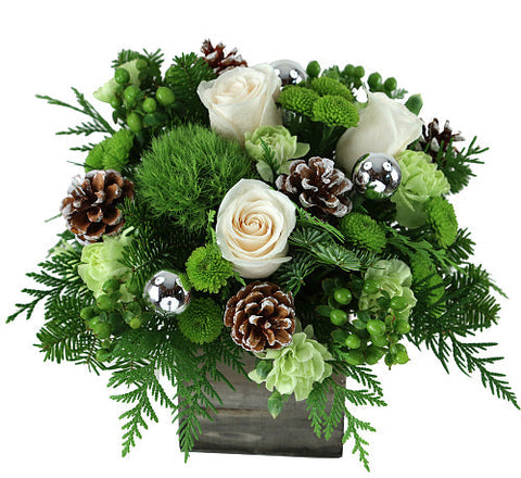 This classic design is full of holiday greens with a touch of white, carnations. frosted pinecones and silver ornaments give this piece an enchanting holiday feel.
