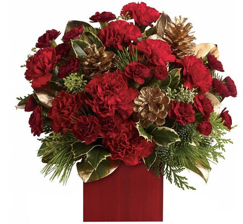 Warm up cold winter days with good cheer! Red roses are delightfully arranged in a glass vase. Featuring red carnations and maroon miniature carnations accented with tips of noble fir, flat cedar, holly, white pine and assorted greens.